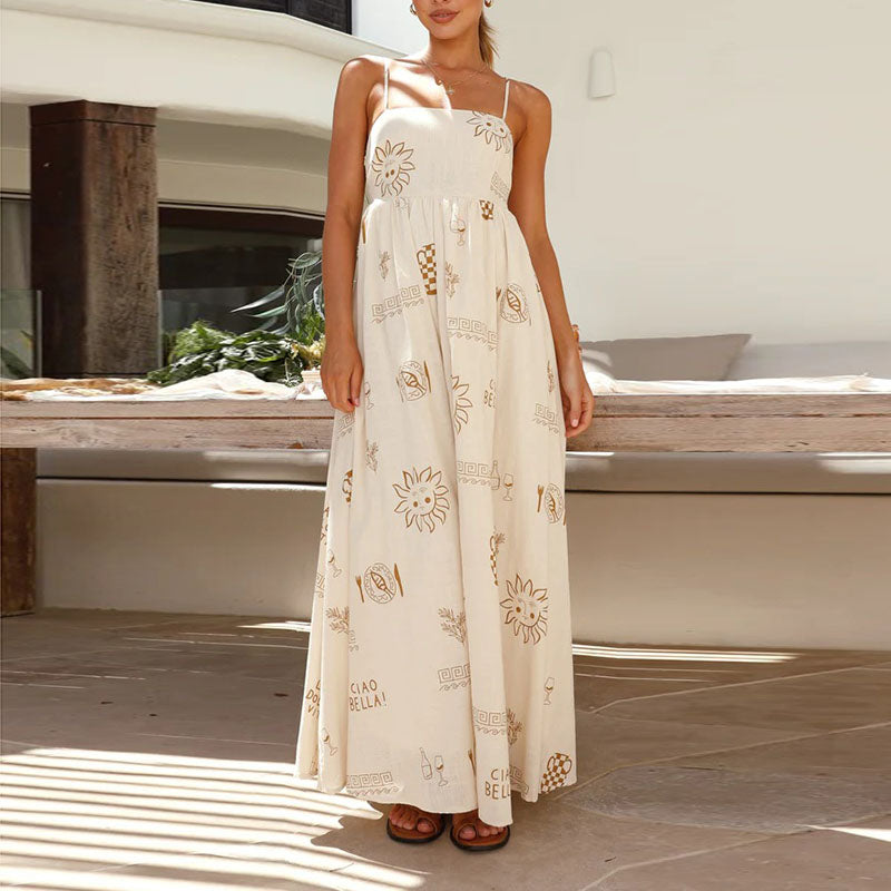 The Aveline Maxi Dress features a playful summer pattern perfect for the season. Its regular fit and square neckline are complemented by stylish cutouts and smocked elements. Made with comfortable polyester material. this dress is perfect for a fun day out in the sun.