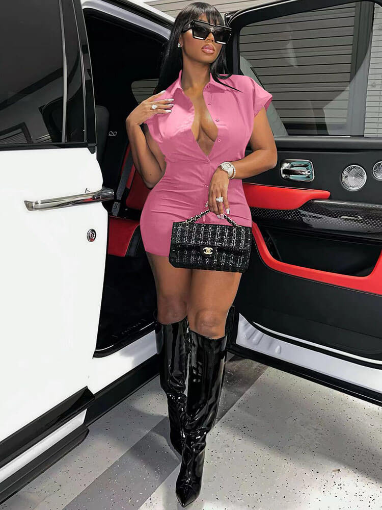 Eigenschaften: Einfarbig. V-Ausschnitt. Umlegekragen. Kurze Ärmel. Gerüscht. Button-Down. Figurbetont. Sexy. Schmale Passform. Minikleider.