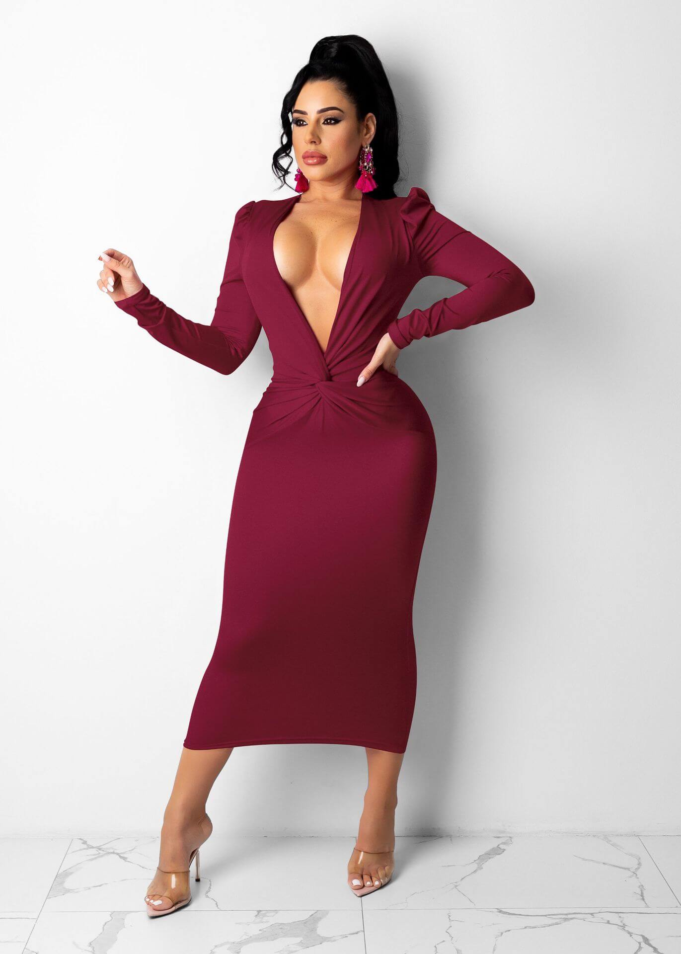 Langärmliges, figurbetontes Midikleid mit tiefem V-Ausschnitt und verdrehter Vorderseite