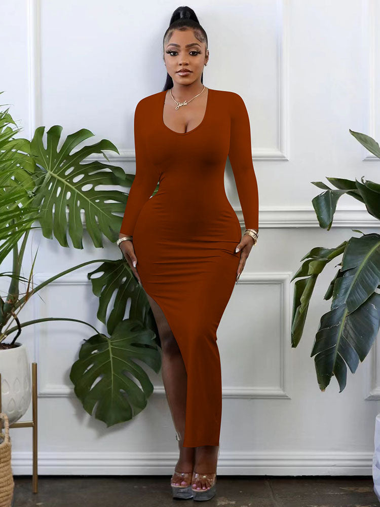 Merkmale: Einfarbig. Gerüscht. Rundhalsausschnitt. Hoher Schlitz. Lange Ärmel. Figurbetont. Schmale Passform. Sexy. Asymmetrisch. Midikleider.