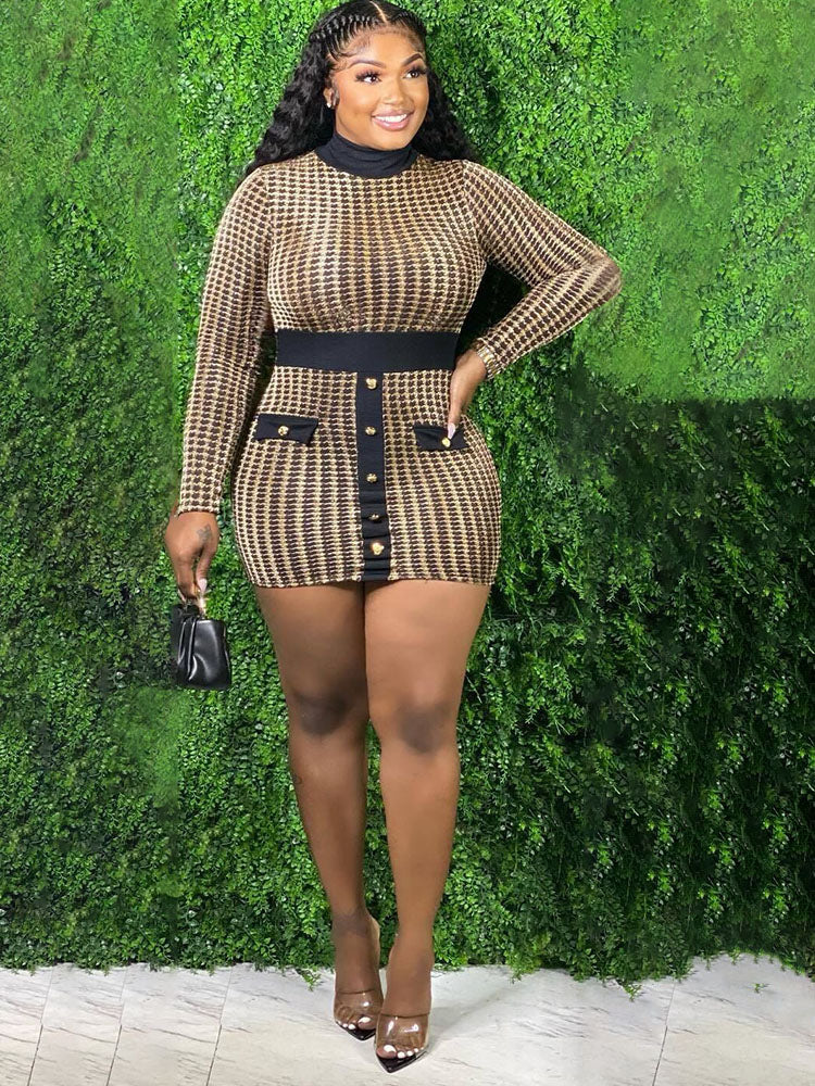 Merkmale: Lange Ärmel. Rollkragen. Karomuster. Knopf. Figurbetontes Minikleid.