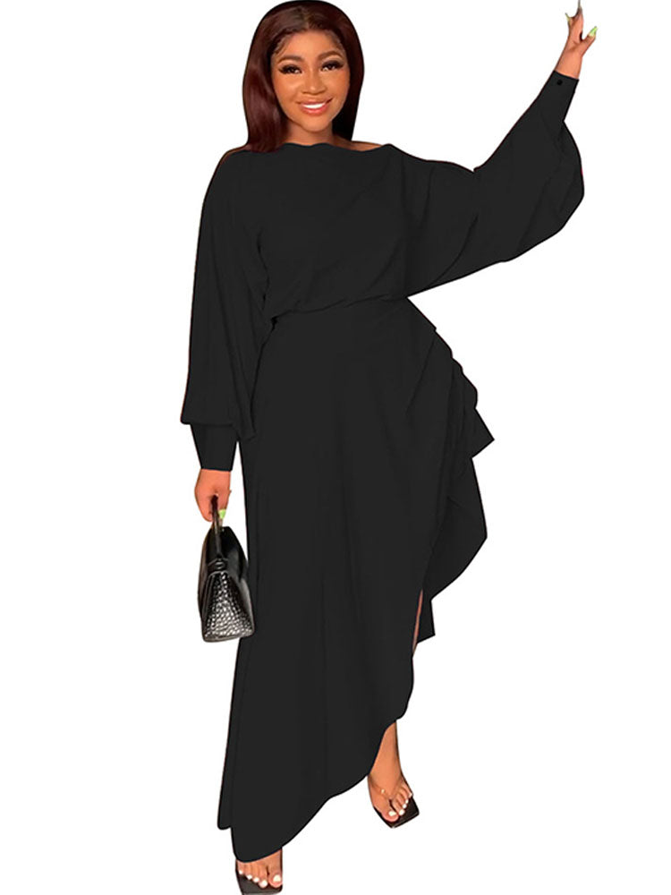 Merkmale: Lange Ärmel. Laternenärmel. schulterfrei. gerüscht. asymmetrisch. einfarbig. fließend. Maxikleider.