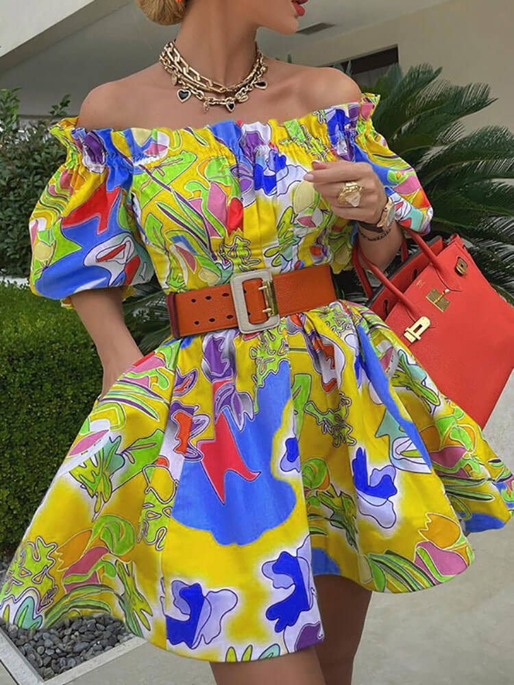 Merkmale: Kurze Ärmel. Elastisches Off-Shoulder-Design. Hohe Taille. Batikdruck. Geraffte Minikleider.