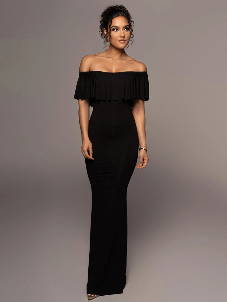 Eigenschaften: Ärmellos. Off-Shoulder. Einfarbig. Rüschen. Maxikleider.