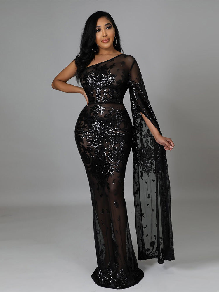 Merkmale: Lange Ärmel, eine Schulter, durchsichtig, Pailletten, Netzstoff, figurbetonte Maxikleider.