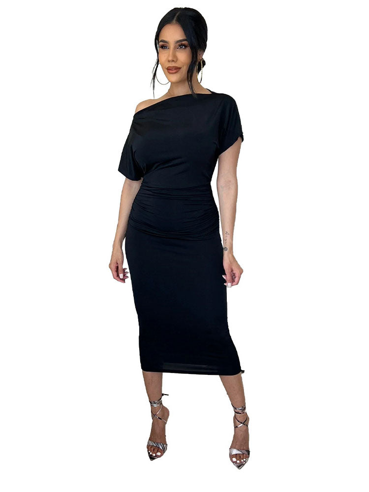 Eigenschaften: Kurze Ärmel. Eine Schulter. Einfarbig. Gerafft. Figurbetont. Elegant. Midikleid.