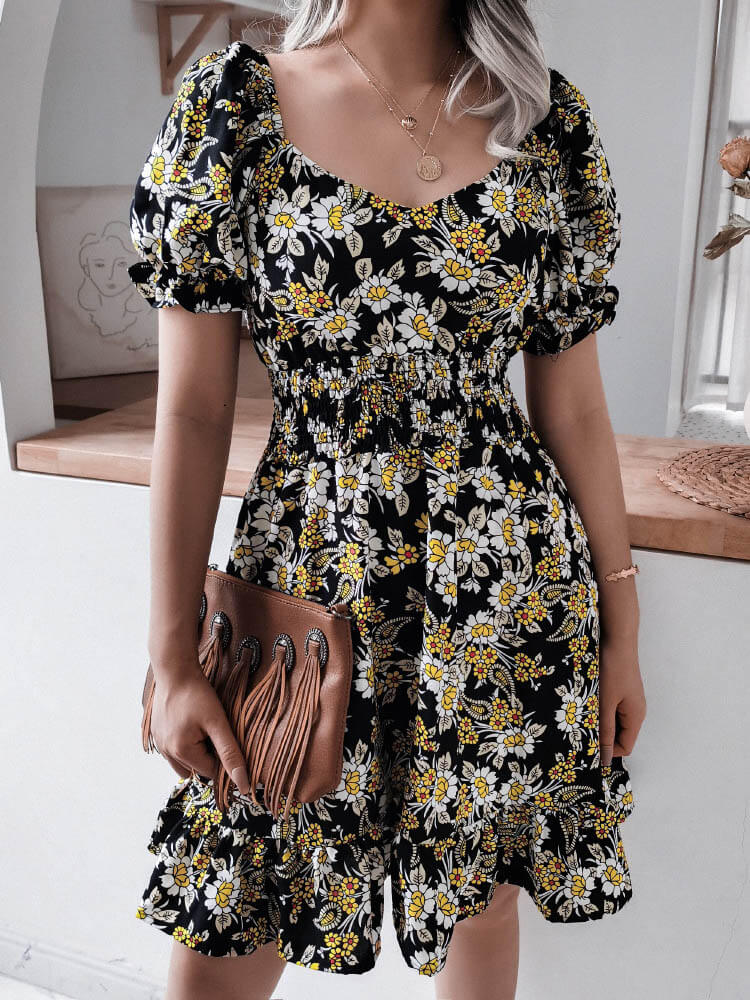Eigenschaften: Puffärmel. Kurzarm. V-Ausschnitt. Blumendruck. Elastischer Bund. Locker. Minilänge. Elegant. Täglich. Sommer.