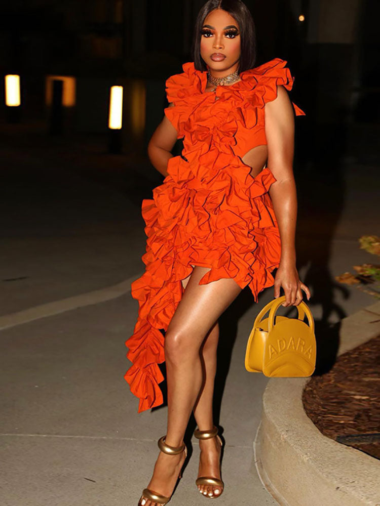 Eigenschaften: Nicht dehnbar. Ärmellos. Aussparung. Einfarbig. Rückenfrei. Kräuseln. Gerüscht. Asymmetrischer Saum. Minikleid.