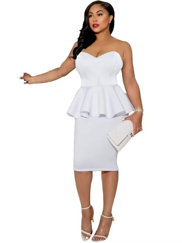 Merkmale: Schulterfrei. Ärmellos. Trägerlos. Rüschen. Reißverschluss. Hohe Taille. Einfarbig. Figurbetont. Midikleider.