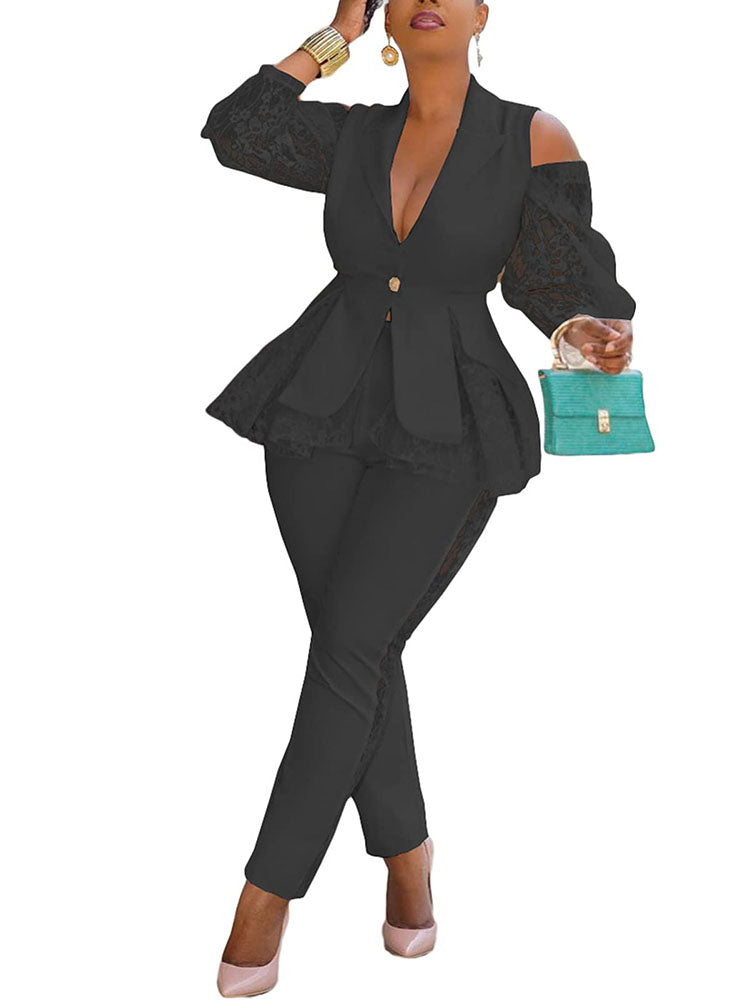 Merkmale: Zweiteilige Outfits. Lange Ärmel. Kalte Schultern. Spitzen-Patchwork. Schößchensaum. Blazerjacke. Einfarbig. Lange Hosen.