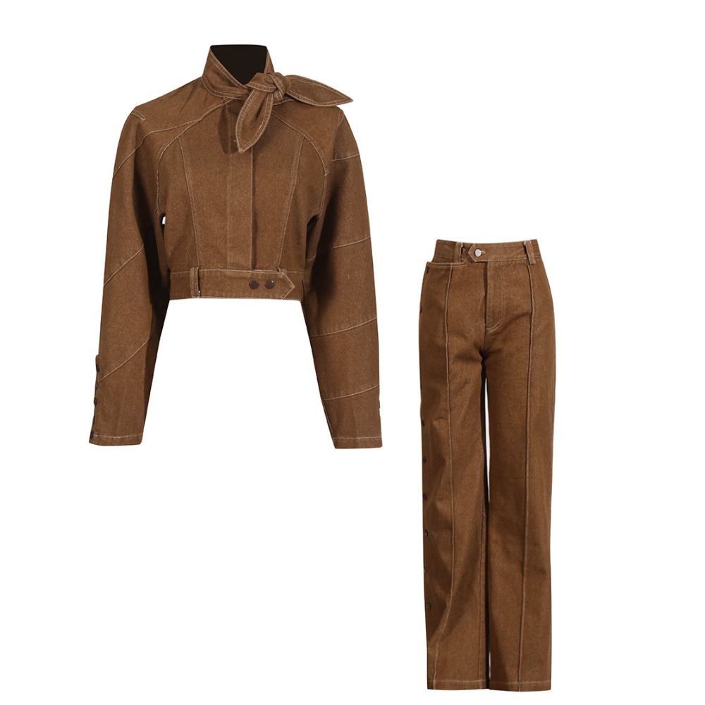 Effortlessly cool and totally timeless. the Clara Vintage-Chic Brown Co-Ord Set is your new go-to for standout style. Featuring a cropped jacket with button accents and a tie neck paired with high-waisted. straight-leg trousers. this set serves retro vibes with a modern edge. Perfect for dressing up or down. it's the statement outfit your wardrobe has been waiting for.