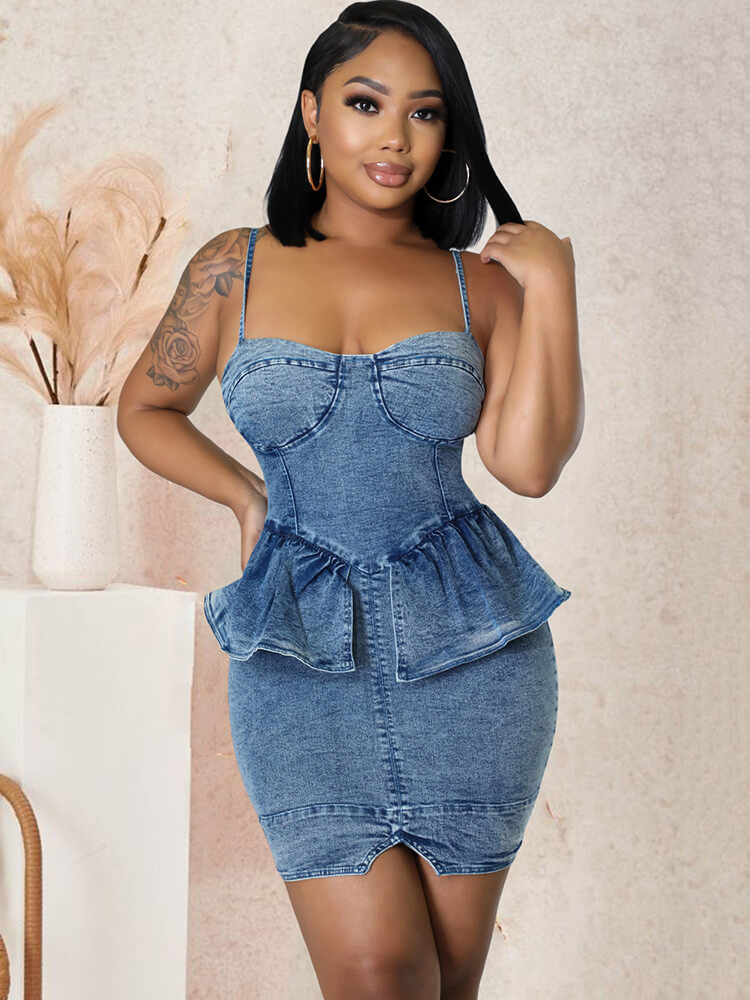 Minivestidos ajustados con volantes y tirantes finos de mezclilla