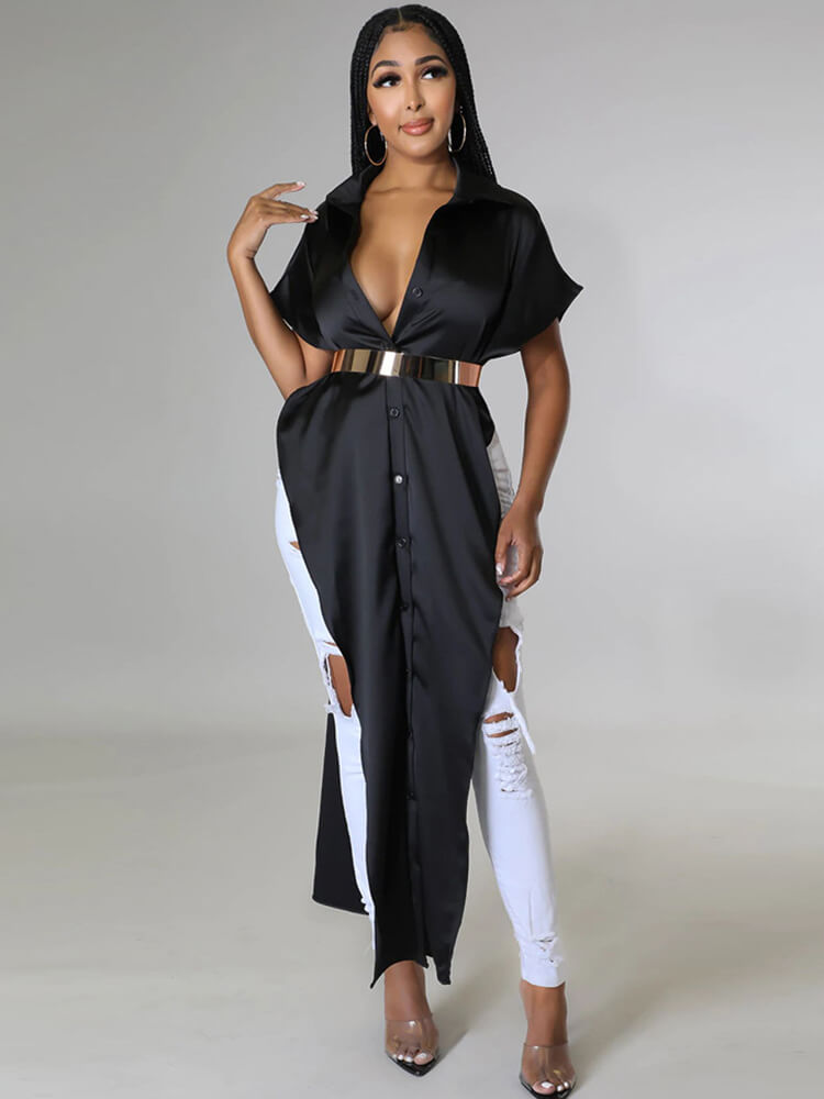 Características: Seda de emulación. Color sólido. Cuello en V. Manga corta. Casual. Suelto. Irregular. Manga de murciélago. Tops largos. Botón.