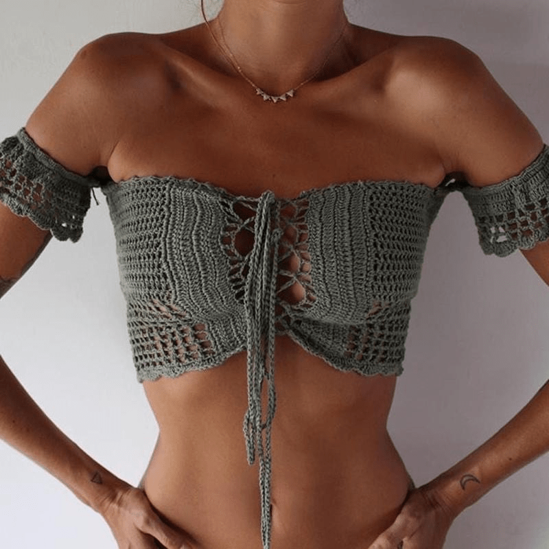 About: Loosen up with this lace up Island Gal Knitted Crop Top. This top features crotchet material and is perfect for the festival days. Pair with high waisted denim shorts or maxi skirt.