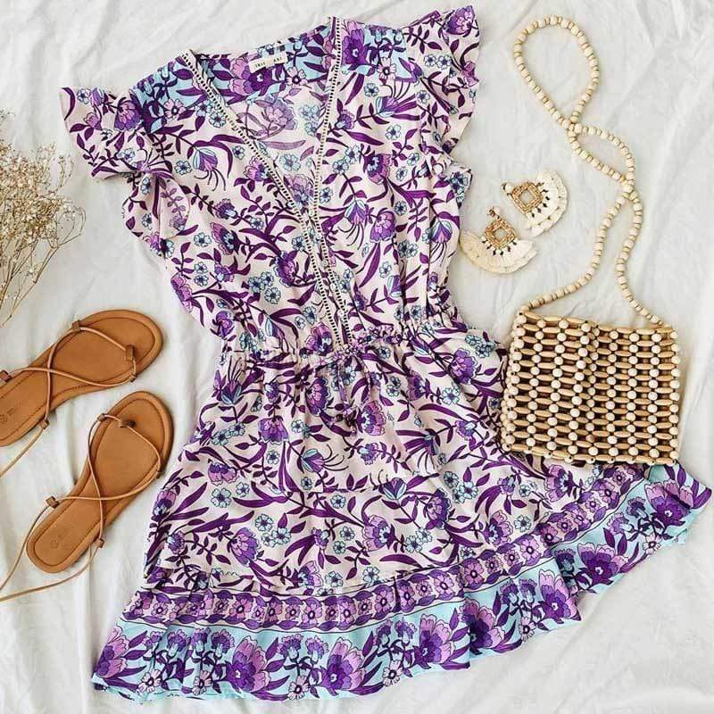 About: The perfect combination of boho & femme. the 'Kelani Dress' features a beautiful purple multi print. v-neckline with embroidered lattice trimmings. button down front. elasticized drawstring waist. ruffling at the sleeves & skirt. & is a slip-on wear item.