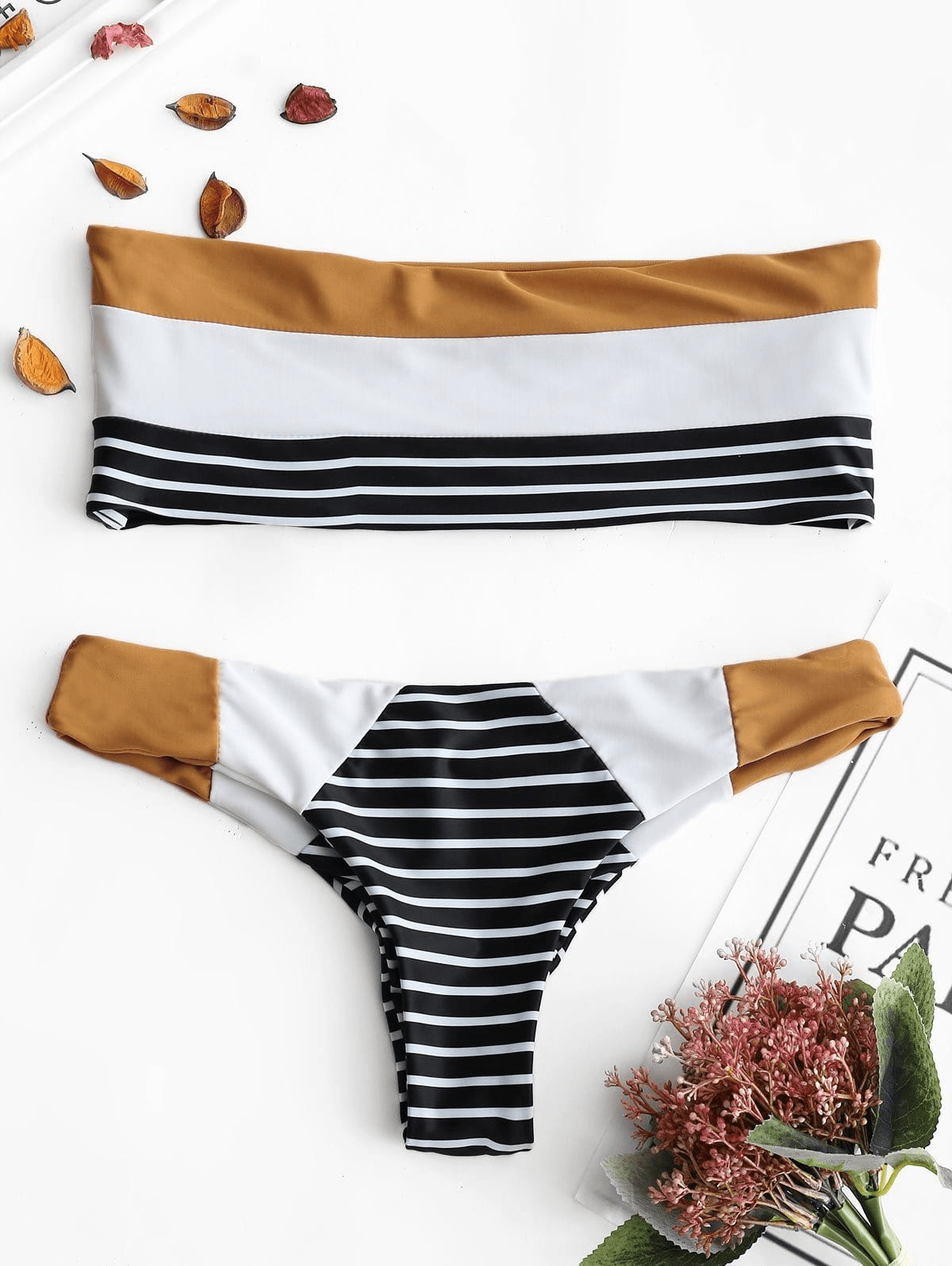 About: We can't decide what we love most about this bikini - the striking print design. or the super-strappy back! At the back. the bandeau top is made up entirely of elastic straps. and the bottoms feature a cheeky Brazilian cut with curve-enhancing ruching.
