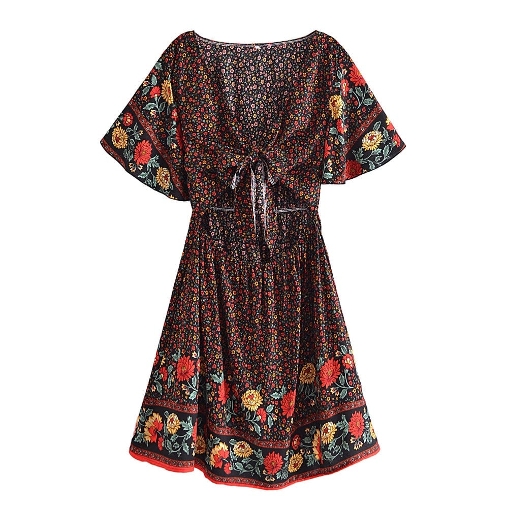 About: This casual floral mini dress from our Boho Love Collection has a shapeless. V-neckline silhouette with short sleeves and a waist-cut-out design for extra shape.