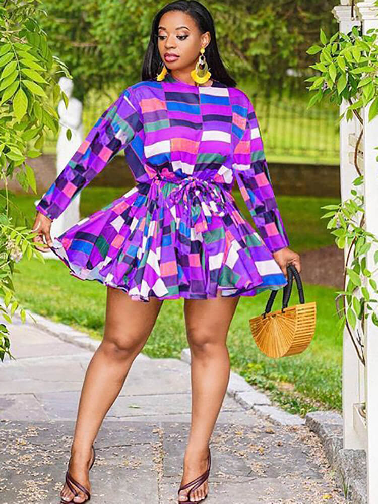 Característica: Estampado a cuadros. Manga larga. Parches. Con cordones. Cuello redondo. Ajustado. Bloque de color. Minivestidos. Con cinturón.