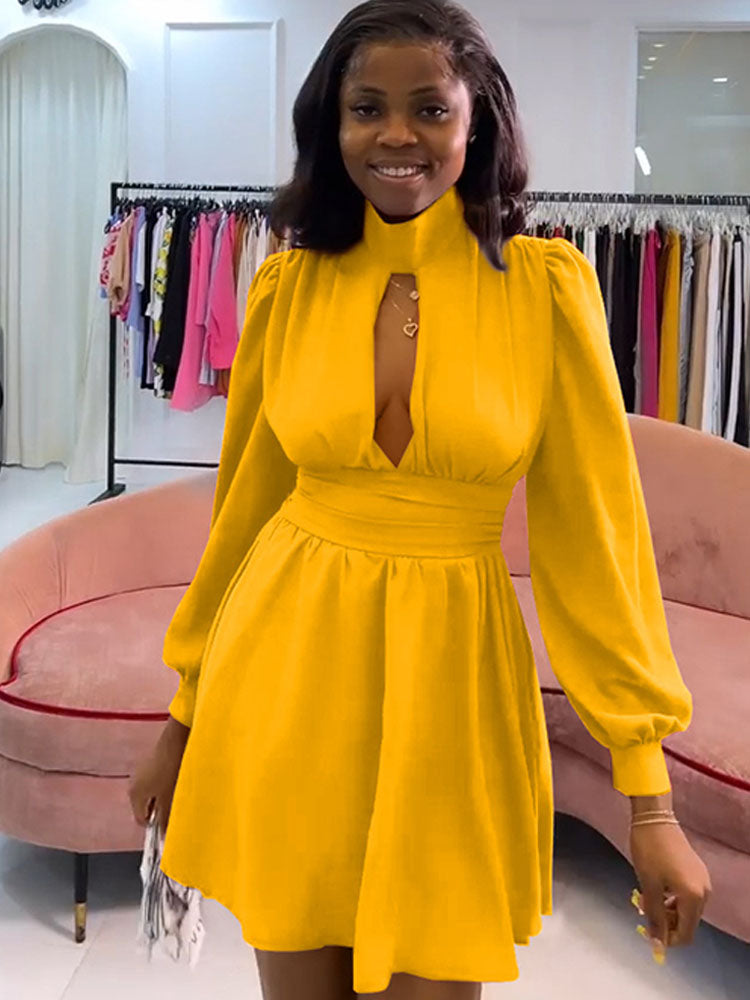 Características: Manga larga. Manga linterna. Color sólido. Recorte. Cuello alto. Cremallera. Vestidos túnica. Vestidos mini.