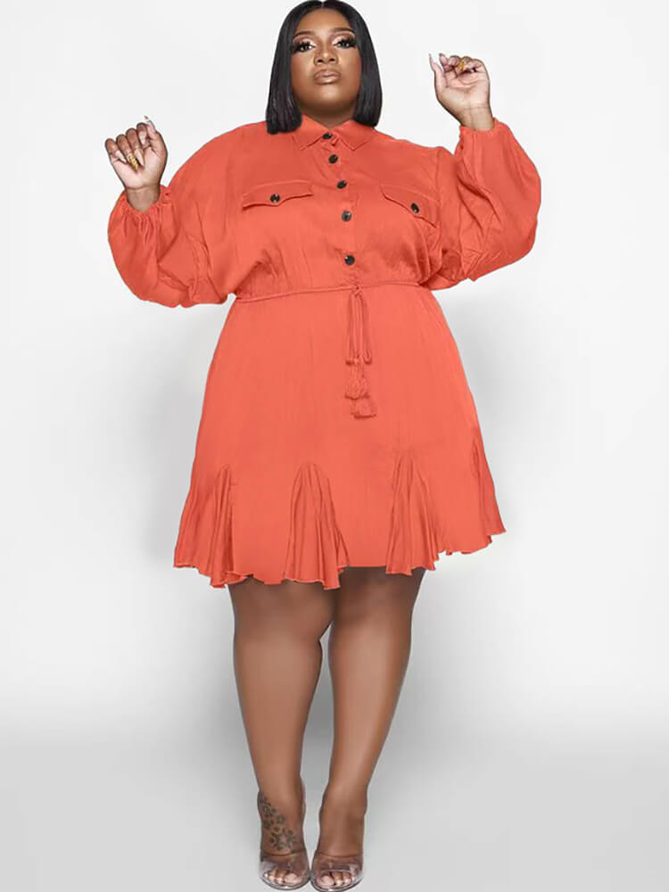 Característica: Manga larga. Cuello. Color sólido. Volantes. Cordón. Botón. Ajustado. Minivestidos.