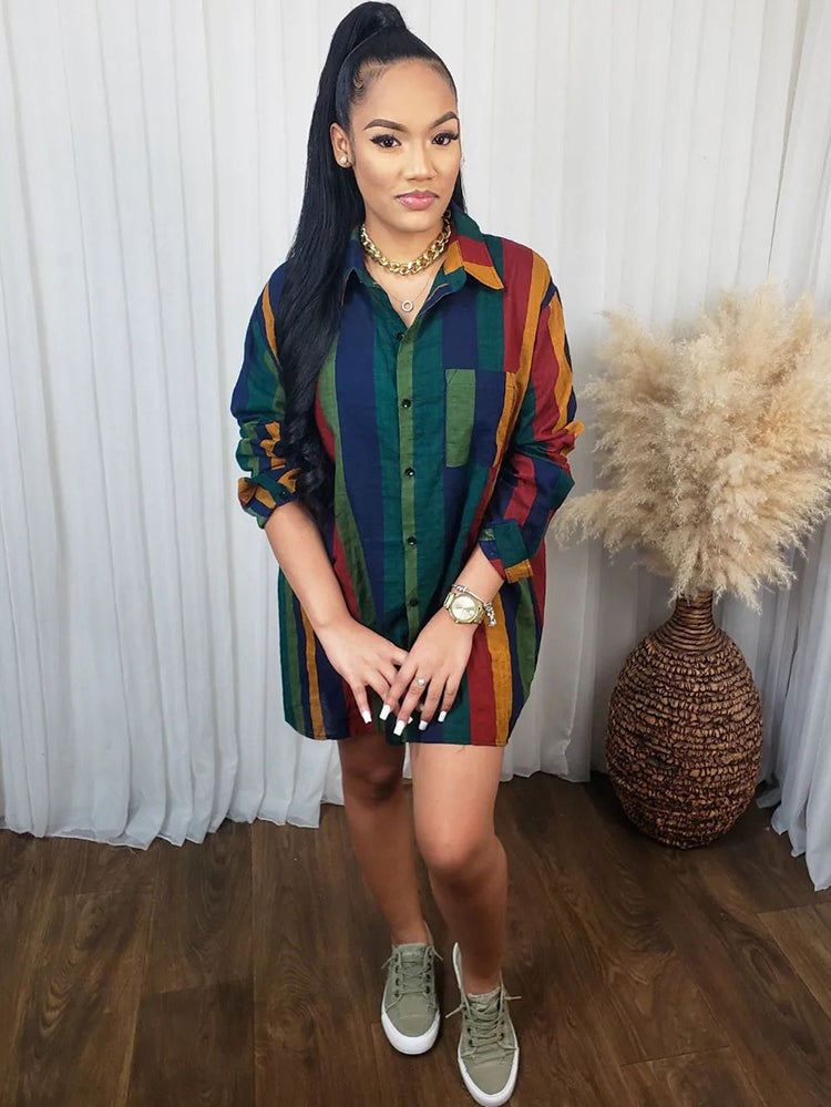 Características: Mangas largas. Botón. Estampado de rayas. Vestido camisero mini suelto.