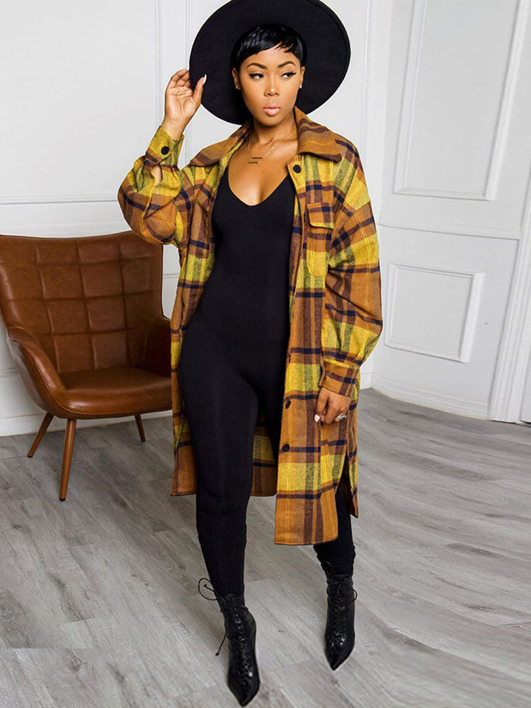 Características: Mangas largas. Solapa. Estampado a cuadros. Botón. Abrigos largos con bolsillos.