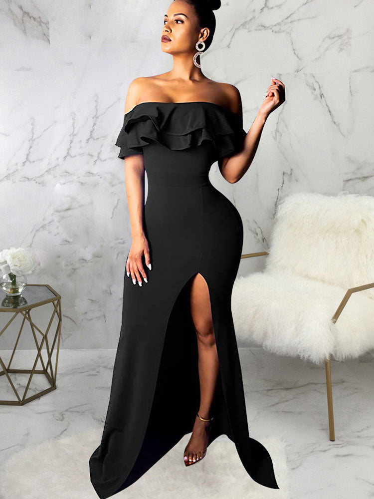 Características: Hombros descubiertos. Mangas con volantes. Abertura. Espalda descubierta. Cintura alta. Largo hasta el suelo. Largo hasta el suelo. Ajustado. Elegante. Sexy. Vestidos largos.