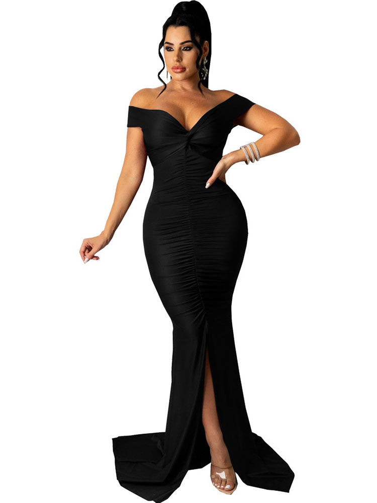 Vestidos largos fruncidos con abertura y escote en V y hombros descubiertos