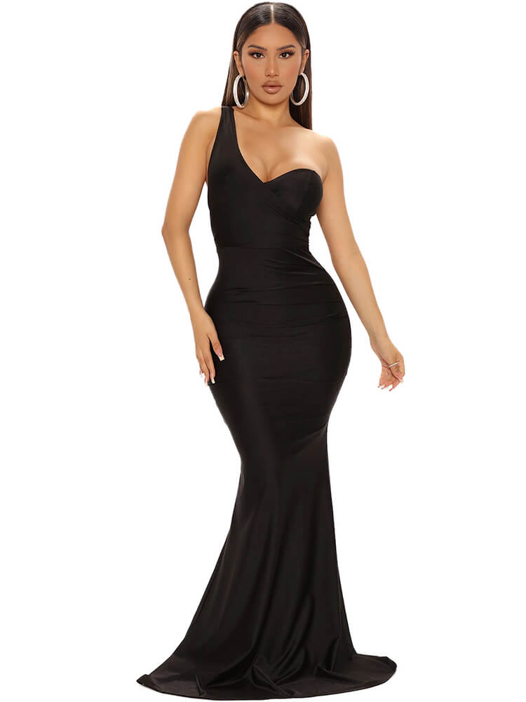 Características: Un hombro. Sin mangas. Color sólido. Sin espalda. Ajustado. Fruncido. Vestidos largos.