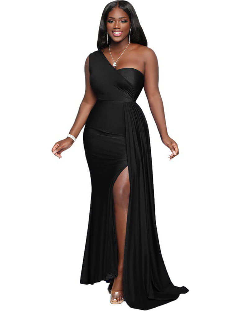 Características: Un hombro. Sin mangas. Color sólido. Fruncido. Abertura lateral. Cintura alta. Ajustado. Vestidos largos.