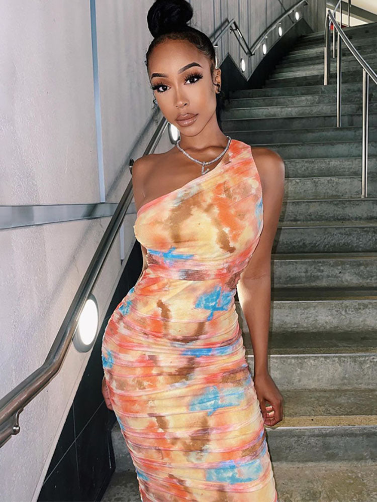 Características: Sin mangas, un solo hombro, estampado teñido anudado, fruncido, vestido midi ajustado.