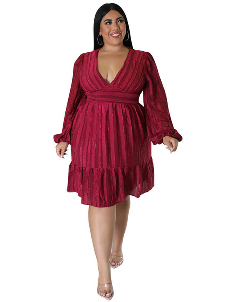 Características: escote en V profundo. manga larga abullonada. volante. color sólido. cintura alta. talla grande. mini vestidos.