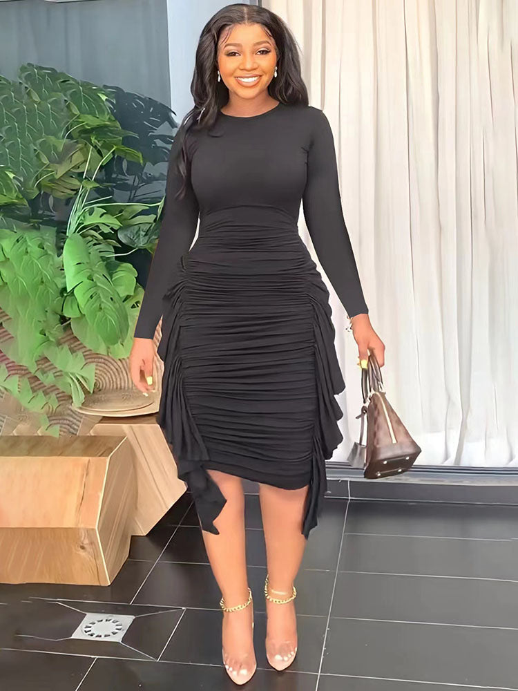 Característica: Talla grande. Mangas largas. Cuello redondo. Color sólido. Cintura alta. Fruncido. Volante. Vestido mini ajustado.