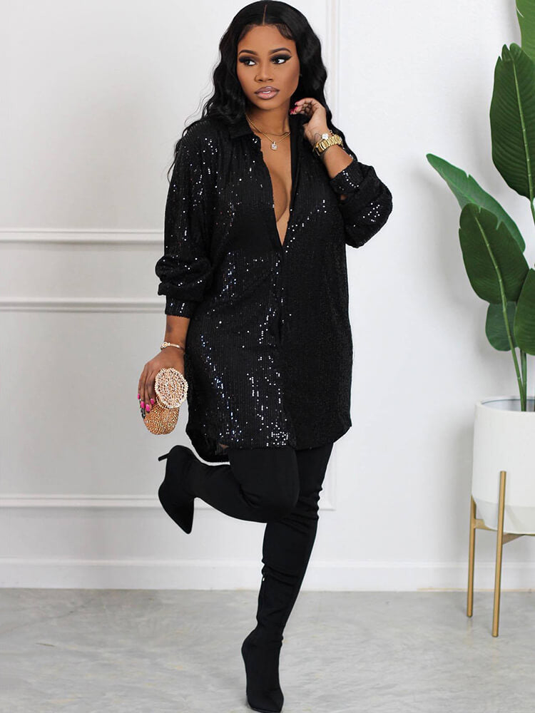 Característica: Lentejuelas. Manga larga. Brillo. Malla. Parches. Ajustado. Abotonado. Camisa larga. Minivestidos. Forrado.