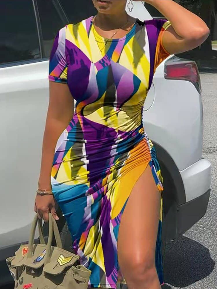 Diseño: Estampado de letras. Estampado de leopardo. Tie-dye. Manga corta. Cordón ajustable. Fruncido. Entallado. Abertura alta. Cuello redondo. Vestido midi. Luce una figura radiante. Llama la atención. Extremadamente sexy y llama la atención al mostrar tus curvas.