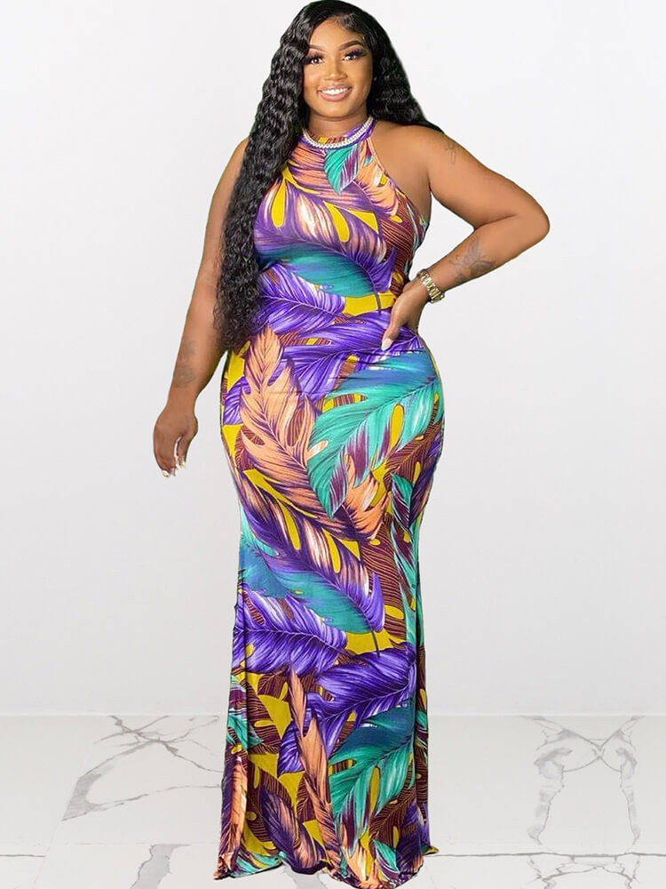 Característica: Cuello halter. Sin mangas. Tie-dye. Estampado floral. Ahuecado. Ajustado. Vestidos largos.