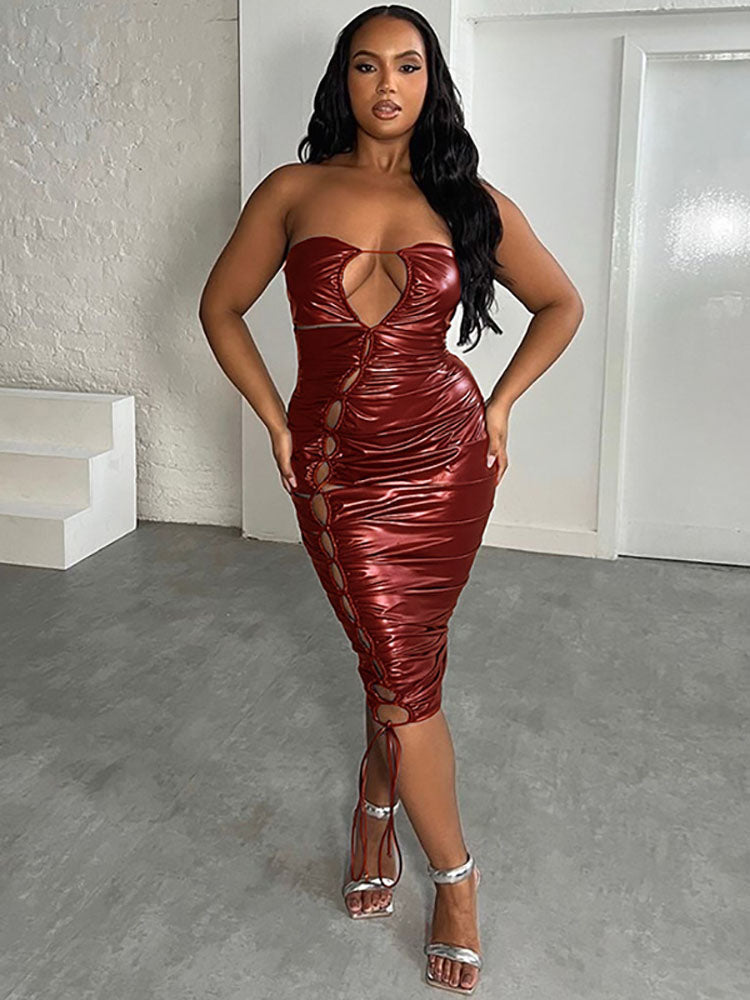 Características: Sin mangas. Ahuecado. Color sólido. Fruncido. Con lazo. Vestido midi ajustado.