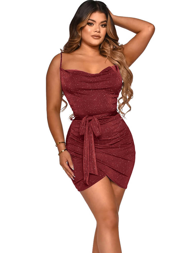 Característica: Sexy. Entallado. Con cinturón para atar. Tirantes finos. Cuello redondo. Sin mangas. Color sólido. Sin espalda. Fruncido. Dobladillo irregular. Minivestidos.