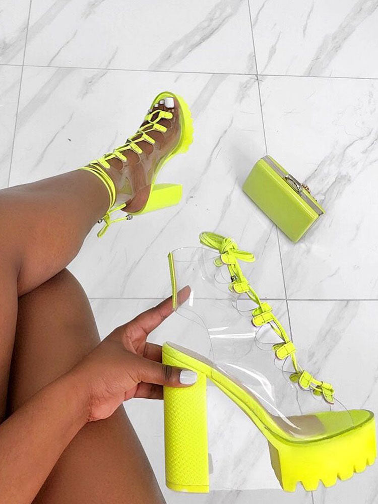 Tacones gruesos transparentes con punta abierta y cordones