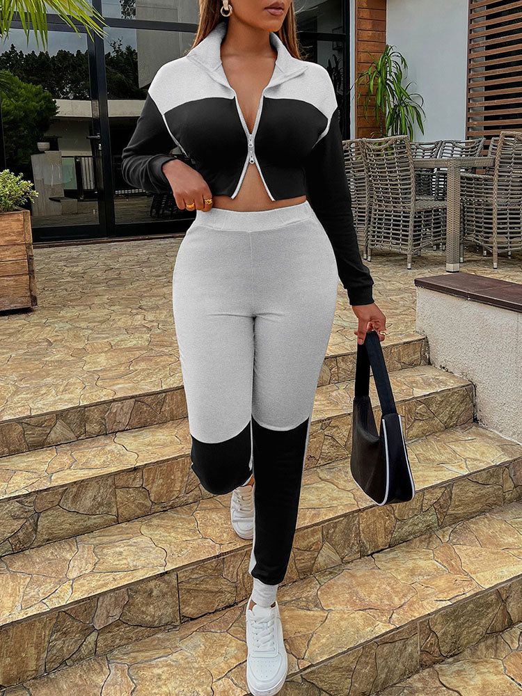 Características: Conjuntos de dos piezas. Mangas largas. Cremallera. Top corto. Bloque de color. Cintura elástica. Pantalones largos.
