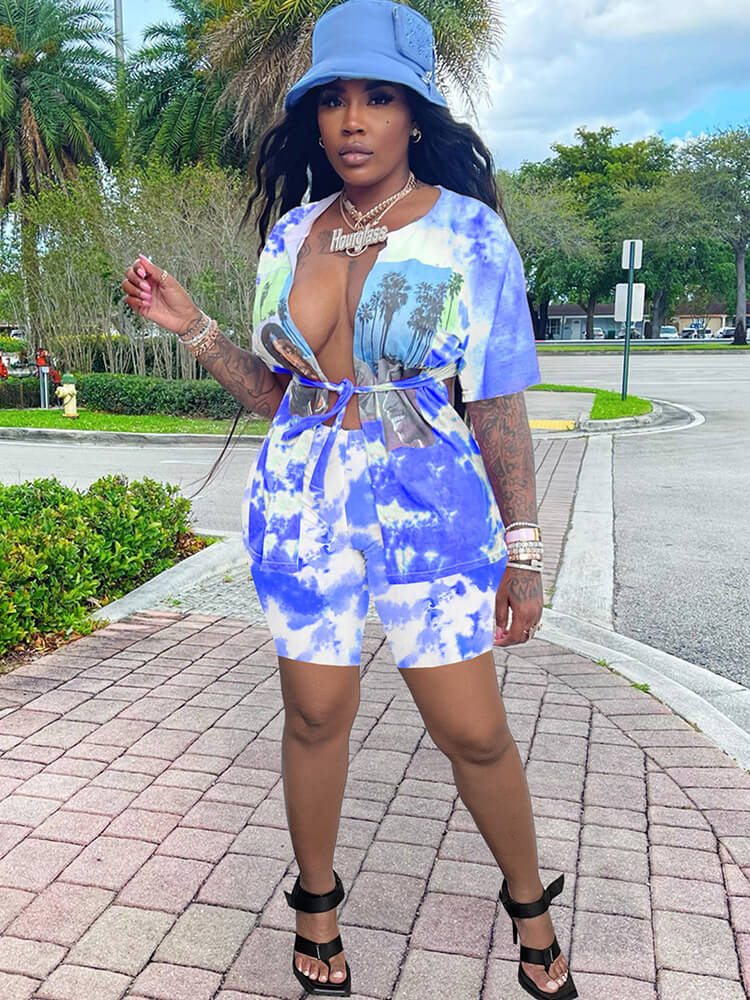 Tops y pantalones cortos tie-dye de manga corta de dos piezas