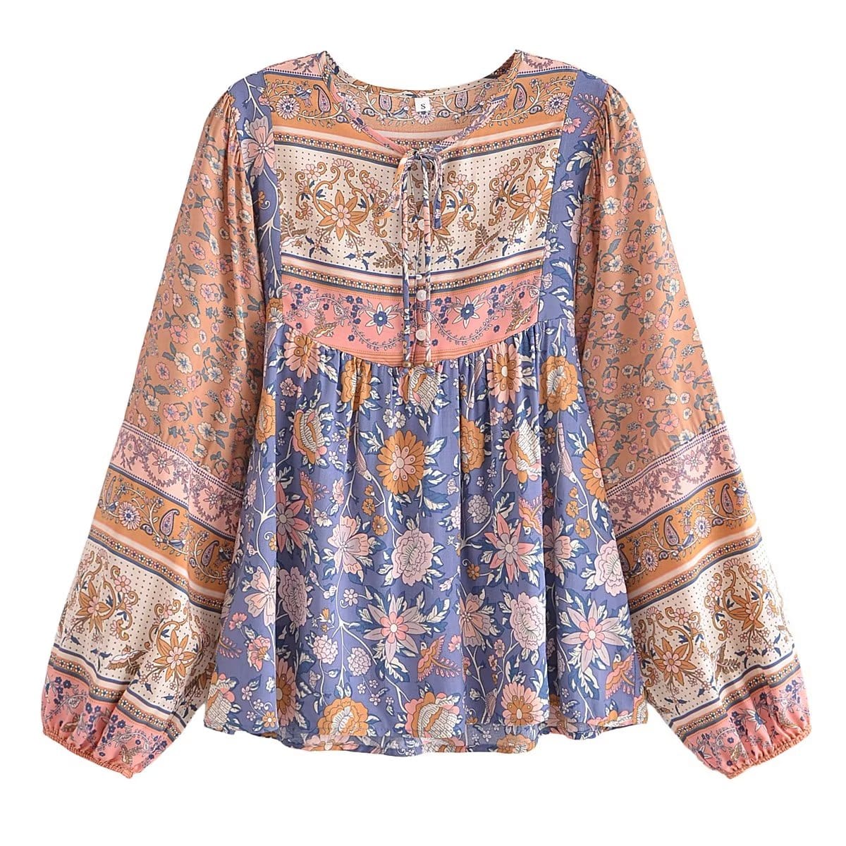 The Zara Boho Long Sleeve Top is the perfect blouse for any season. Features lightweight Rayon fabric. pretty orange floral print throughout. and loose fit. The tie up keyhole neckline is a unique touch that makes this blouse stand out. You can wear this top with jeans. shorts. or skirts for a variety of looks.