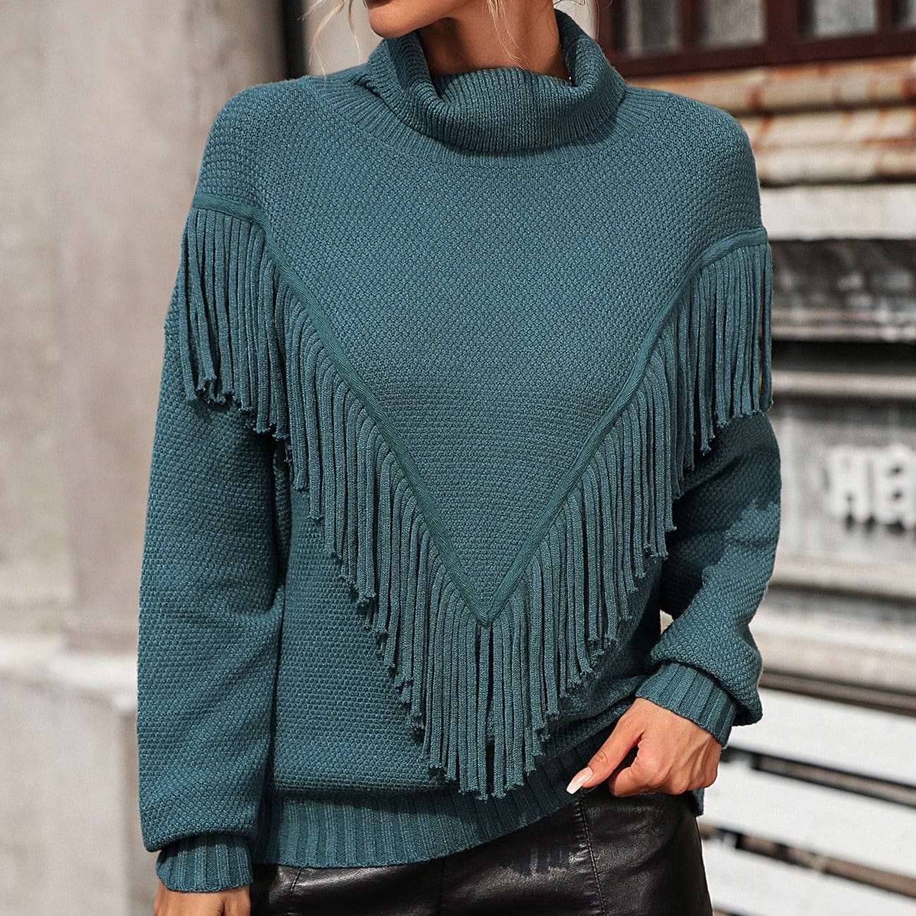 Stay warm and cozy in the Alcmena Turtleneck Sweater! With its loose fit. jersey fabric. and fringe element. this turtle neck sweater is a style statement that won't let you down. The regular top length. long sleeves. and made of high quality viscose make this the perfect piece to bundle up in this season.