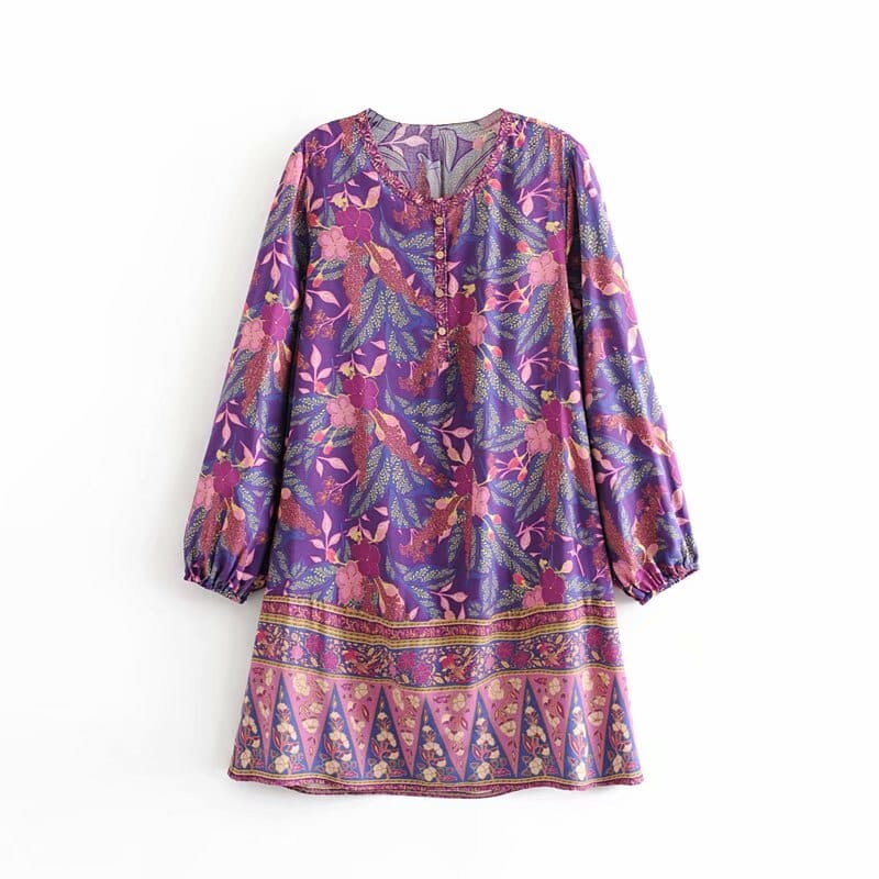 This beautiful dress features a floral print and long sleeves with elasticated cuffs. Plus. the mini length is perfect for showing off your legs! Whether you're headed to the beach or a summer festival. this dress is sure to turn heads.