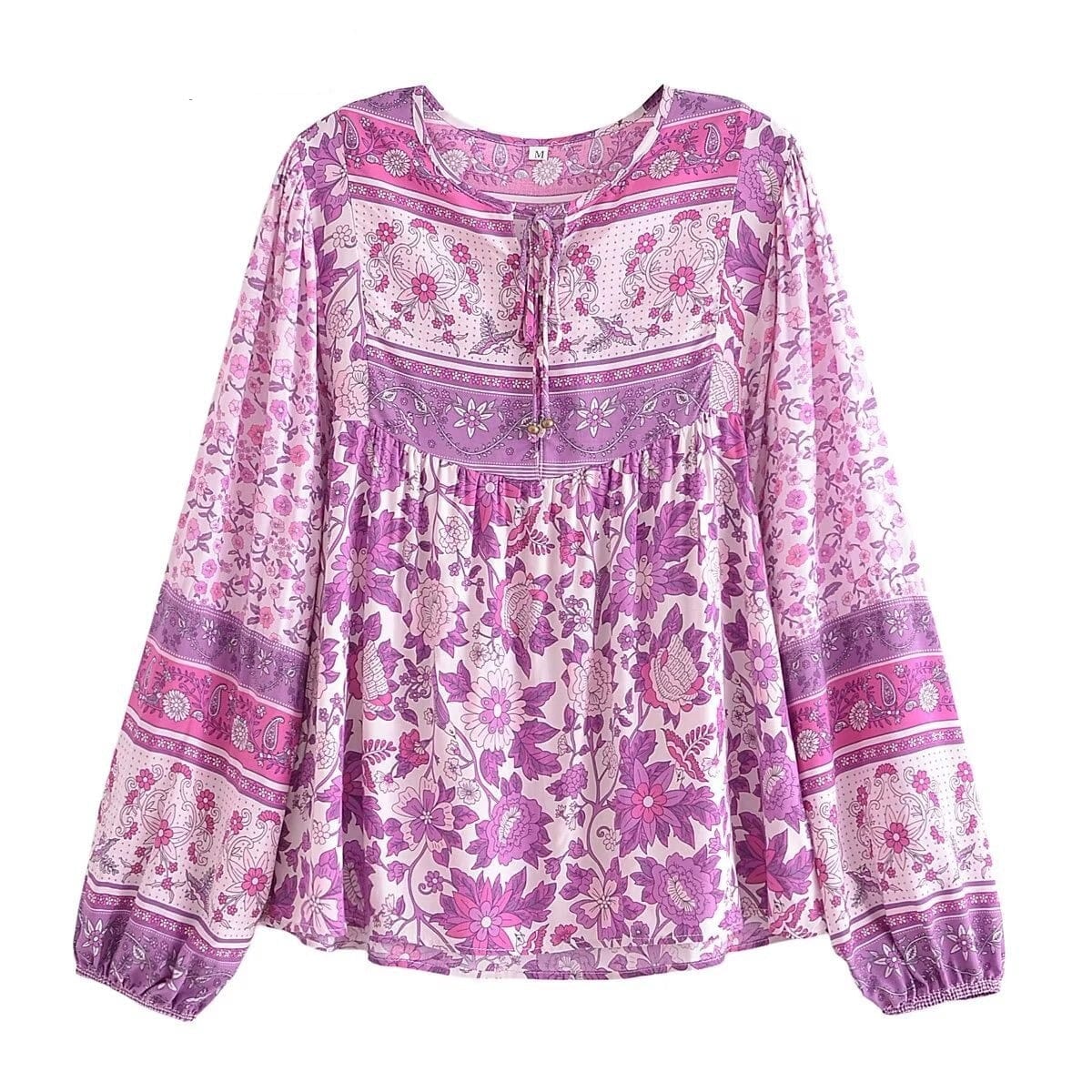 Looking for a pretty and feminine blouse that you can wear all season long? Look no further than the Birdie Long Sleeve Boho Top. This blouse features a beautiful pink floral print throughout. loose fit. and tie up keyhole neckline. The lightweight Rayon fabric is perfect for warm days or layering during cooler weather.