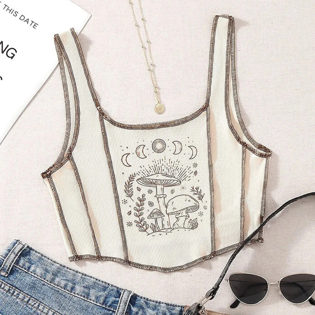 Embrace your inner free spirit with our Boho Mushroom Print Cropped Tank Top. Featuring a whimsical mushroom and celestial design. this top is perfect for adding a touch of bohemian charm to your wardrobe. Pair it with your favorite high-waisted jeans for an effortlessly stylish look.