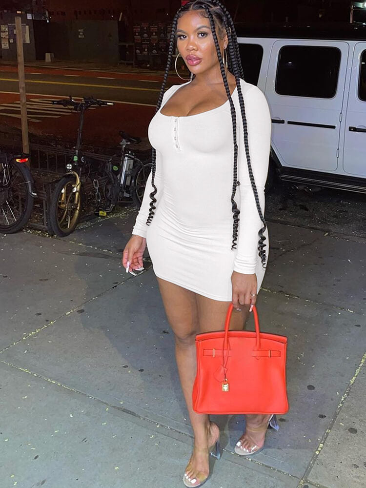 Features:Long sleeve. button. scoop neck. solid color. bodycon. slim fit. mini dress.