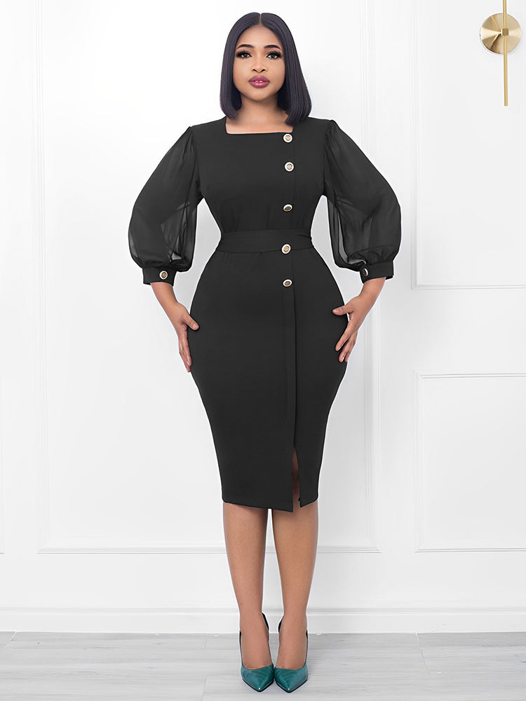 Features:Cropped lantern sleeve. button. patchwork. square neck. split. midi dresses.