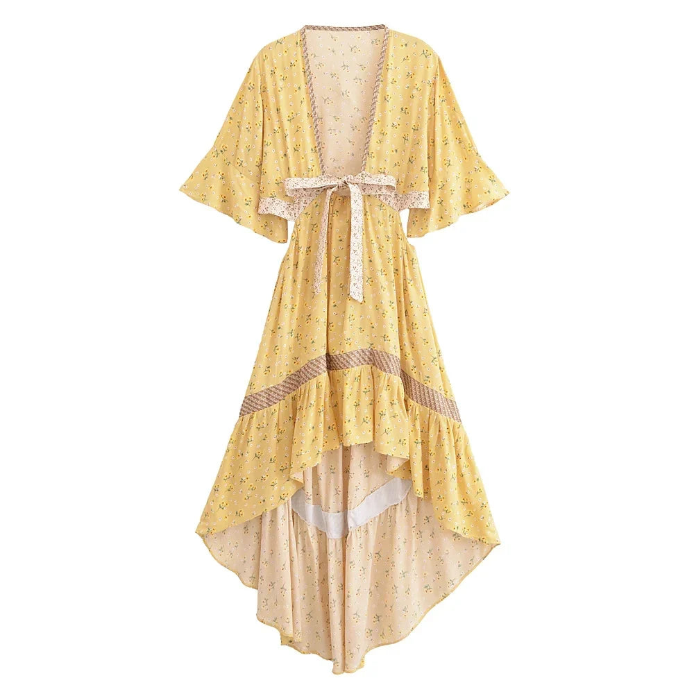 The Elowen Dress in Golden Blossom is your wearable dose of sunshine. This flowing ankle-length dress brings together golden hues and soft floral prints. making it a must-have for dreamy summer days. The deep V-neckline. loose fit. and kimono-style flutter sleeves give it a breezy. romantic silhouette that flatters without effort.