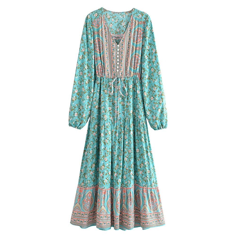 Make a bold statement in the Emerald Blossom Maxi Dress. Featuring a v-neck. empire waistline. and lantern sleeves. you'll be looking and feeling your best. The beautiful floral print. crafted from a blend of cotton and rayon. is sure to turn heads. Be confident and stylish with the Emerald Blossom Maxi Dress.